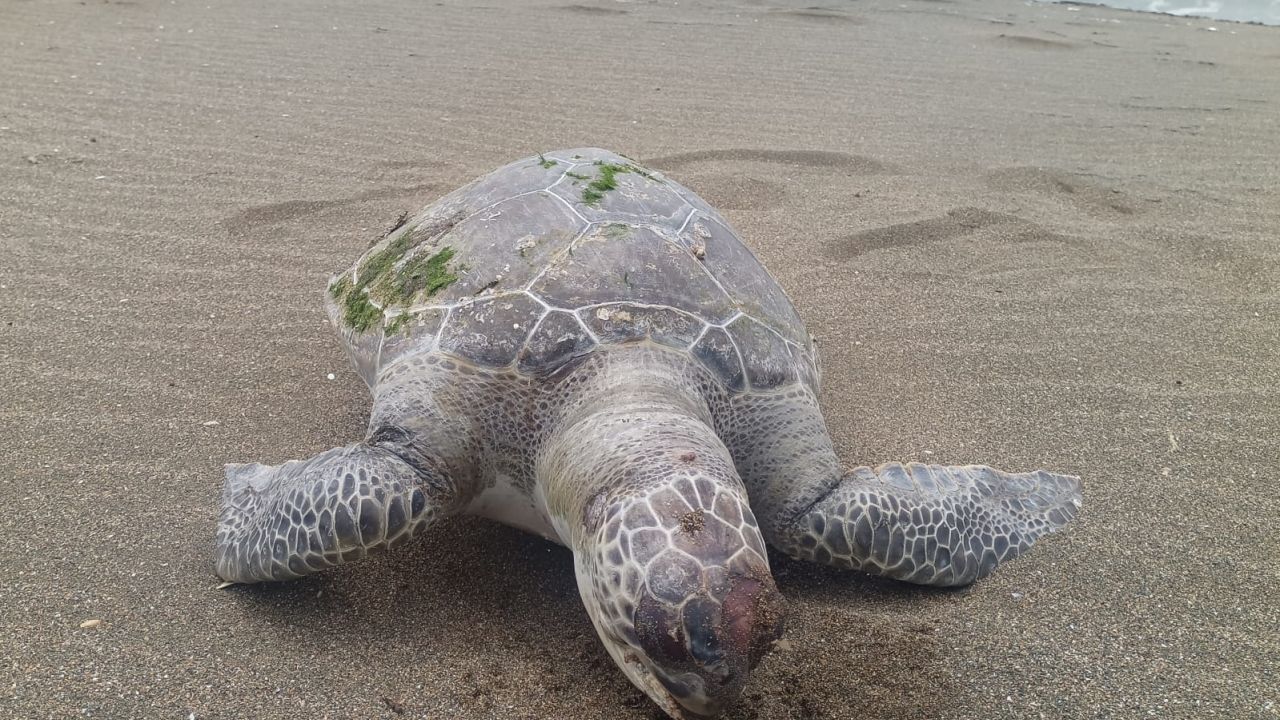 İhbar üzerine bölgeye yönlendirilen belediye ekipleri, öldüğü belirlenen deniz kaplumbağasını kaldırdı.