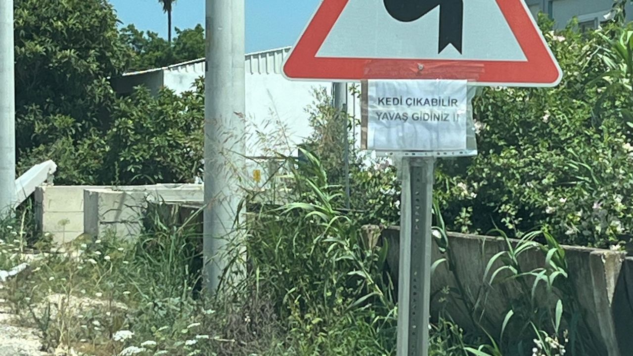 Sanayi Kavşağı'ndan Boğazkent Mahallesi'ne kadar yol güzergahındaki uyarı levhalarına hayvanseverler tarafından "Kedi çıkabilir. Yavaş gidiniz" yazılı kağıtlar yapıştırıldı.