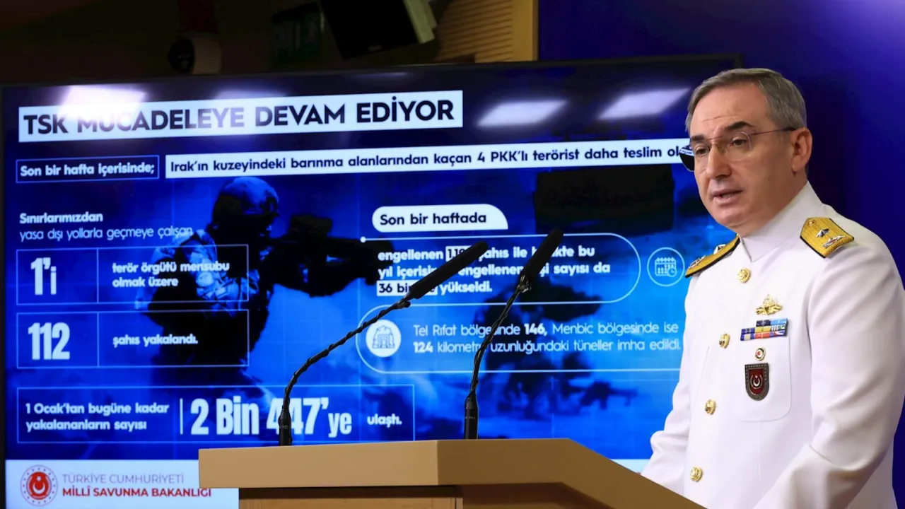 Milli Savunma Bakanlığı, Türk Silahlı Kuvvetleri’nin son bir haftada yürüttüğü operasyonlar ve sınır güvenliği faaliyetlerine ilişkin detayları paylaştı. Irak ve Suriye’deki operasyonlarda 4 PKK’lı terörist teslim olurken, yasa dışı sınır geçişlerine karşı 112 kişi yakalandı, bin 192 kişi engellendi.ANKARA (İGFA) - Milli Savunma Bakanlığı’nın haftalık basın bilgilendirme toplantısında, TSK’nın terörle mücadele ve sınır güvenliği faaliyetlerine dair önemli bilgiler aktarıldı.