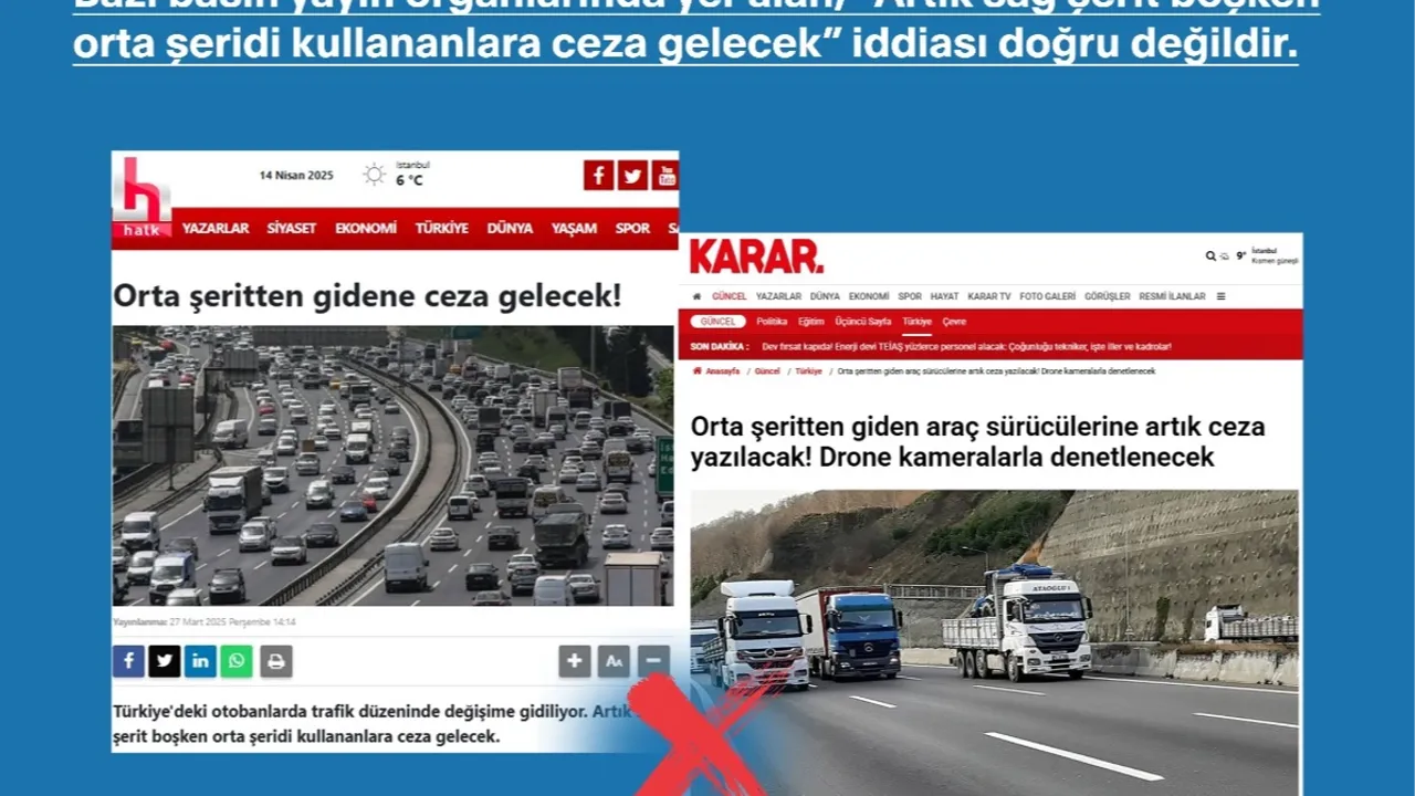 Merkezden yapılan açıklamada, bazı basın yayın organlarında yer alan, “Artık sağ şerit boşken orta şeridi kullananlara ceza gelecek” iddiası doğru olmadığının altı çizildi.