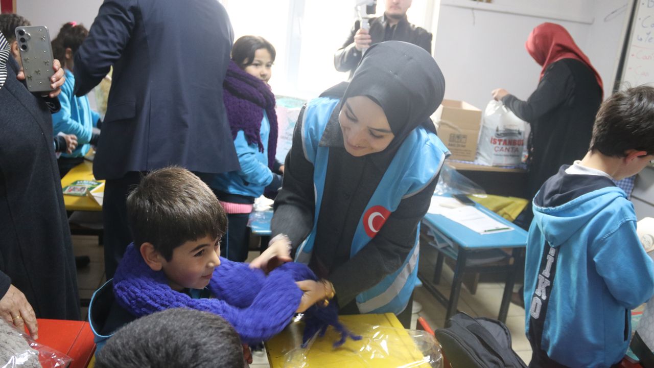 'Kadın ve Aile Koordinatörlüğümüzdeki kadınlar 10 günlük bir atkı örme süreci gerçekleştirdi. Küçük kardeşlerimizin soğuk kış günlerinde hem kalplerini hem de kendilerini ısıtmalarını istediler. Biz de kırtasiye malzemeleri ve kitap hazırlayarak destek olduk. Bugün Levent İlkokulundaki kardeşlerimizle bir araya gelerek hazırladığımız malzemelerin dağıtımını yaptık.'