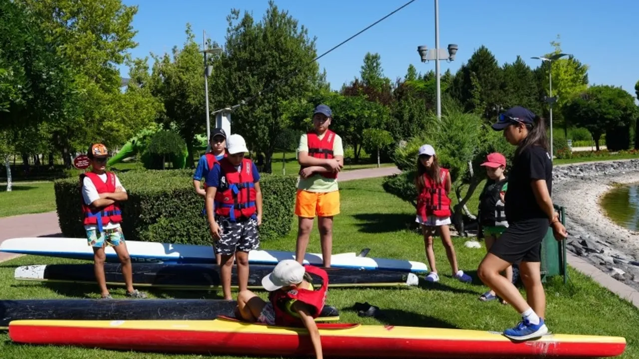 Gençlik ve Spor Hizmetleri Dairesi Başkanlığı tarafından organize edilen eğitimlerde, 8 ile 17 yaş aralığındaki çocuklar, su sporlarıyla tanışarak hem eğleniyor hem de temel kano becerilerini öğreniyor.