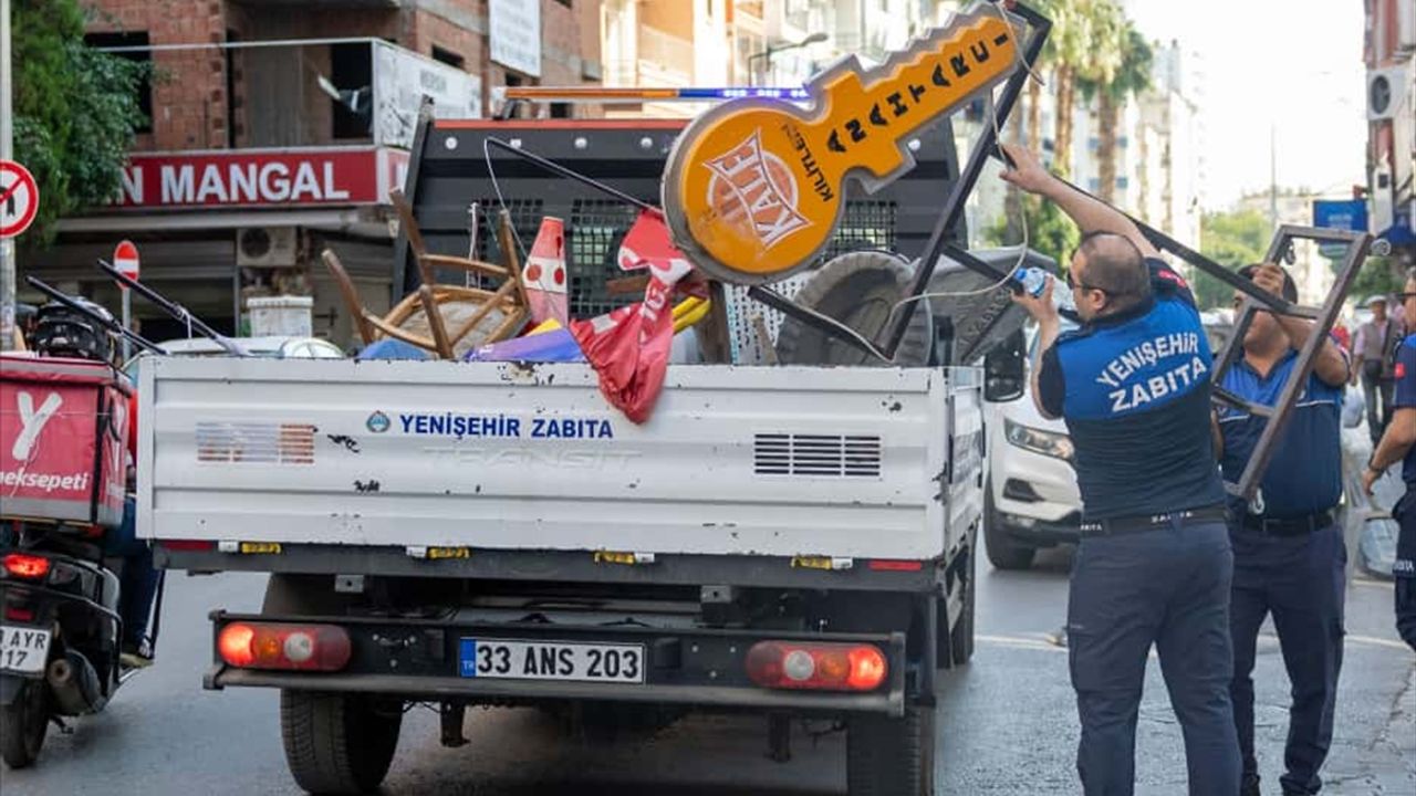 MERSİN (AA) - Mersin'in Yenişehir ilçesinde zabıta ekipleri, kaldırımlara konulmaları nedeniyle yaya trafiğini olumsuz etkileyen malzemeleri kaldırdı.